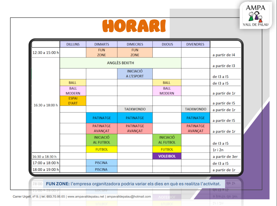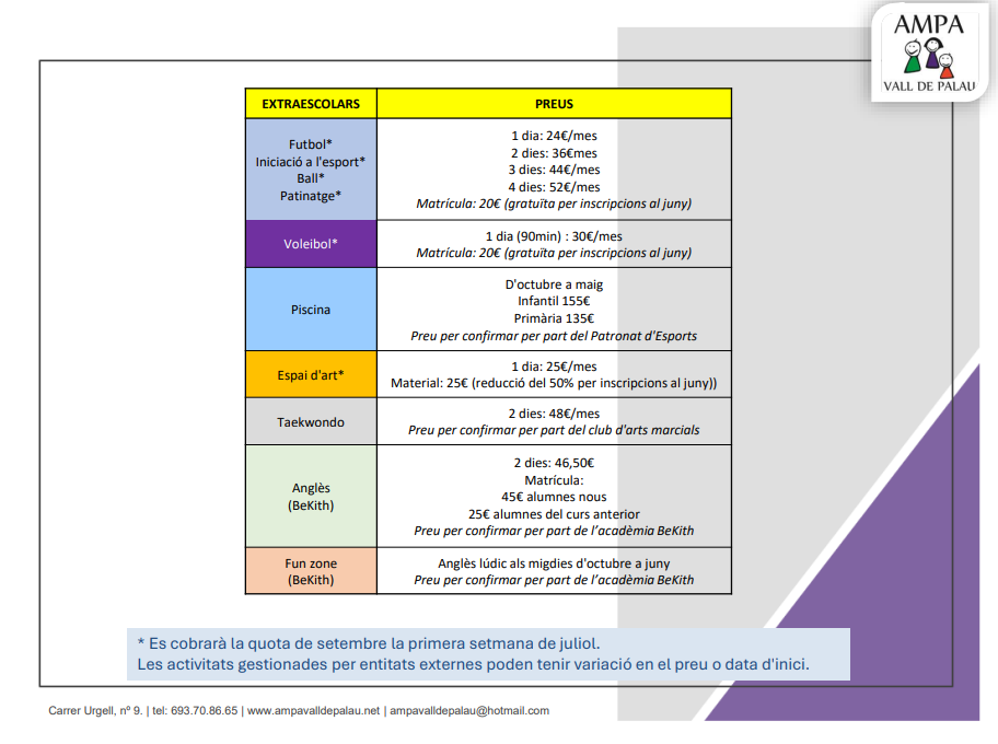 En el cas de l’extraescolar de piscina, la inscripció serà de l’1 al 7 de juliol. Estem a l’espera de disposició de places per part del poliesportiu. Us mantindrem informats.